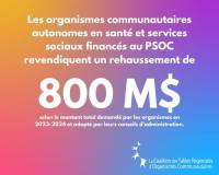 Le 5 décembre 2023, la Coalition des Tables Régionales d’Organismes Communautaires (CTROC) a fait parvenir une lettre au ministre des Finances, Éric Giard, pour exprimer les besoins financiers des organismes communautaires autonomes du secteur de la santé et des services sociaux, financés à la mission globale dans le cadre du Programme de soutien aux organismes communautaires, le PSOC.