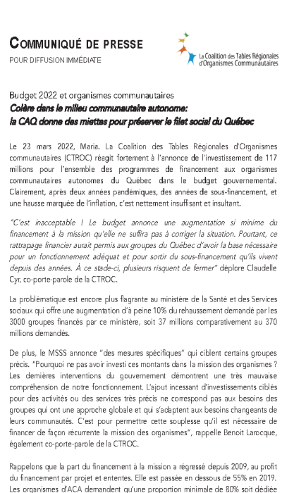 La Coalition des Tables Régionales d'Organismes communautaires (CTROC) réagit fortement à l'annonce de l'investissement de 117 millions pour l'ensemble des programmes de financement aux organismes communautaires autonomes du Québec dans le budget gouvernemental. Clairement, après deux années pandémiques, des années de sous-financement, et une hausse marquée de l'inflation, c'est nettement insuffisant et insultant.