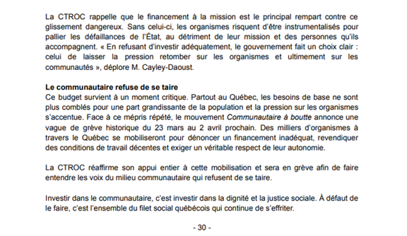 Le tout récent budget du Québec est largement insuffisant et ignore encore une fois les besoins criants des organismes communautaires autonomes. Alors que les groupes en santé et services sociaux ont exprimés des besoins de 911 M $, dont 61,3 M $ pour les l'Estrie, le gouvernement du Québec a choisi d'investir un maigre 20 M $, soit à peine 2% des besoins exprimés.
