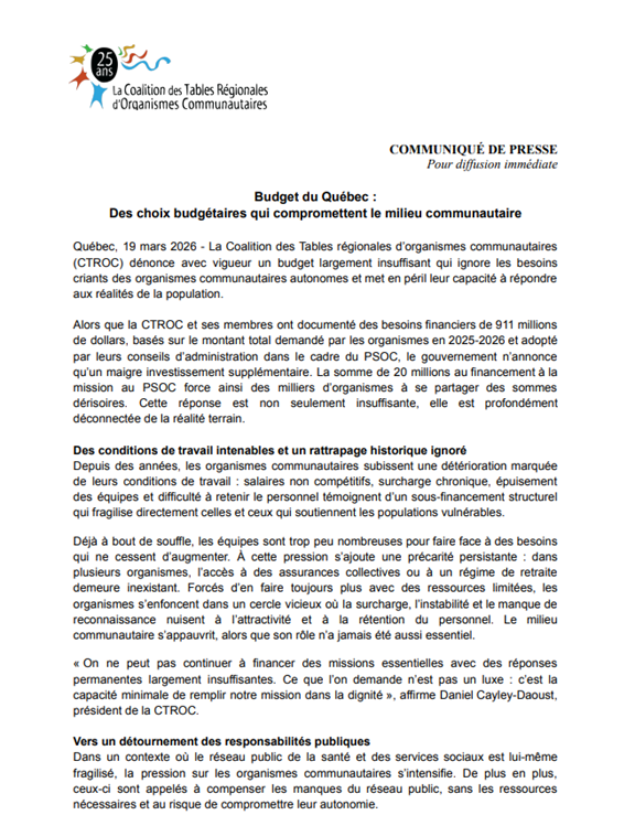 Pour en savoir plus, télécharger communiqué de presse de la Coalition des Tables régionales d'organismes communautaires: