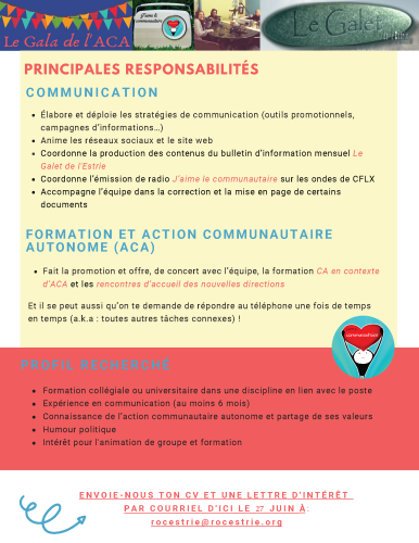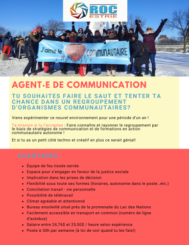 ► Voir notre nouvelle offre d'emploi : Agent.e de communication au Regroupement des organismes communautaires (ROC) de l'Estrie