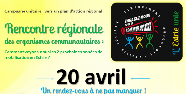 Sherbrooke, 20 avril 2017- Suite au budget très décevant du gouvernement Couillard, les organismes communautaires autonomes de l'Estrie se donnent rendez-vous ce matin, au Club Aramis de Magog, pour discuter de la mobilisation en Estrie et des moyens à prendre pour obtenir un rehaussement de leur financement pour leur mission, l'indexation et le respect de leur autonomie d'ici le budget du Québec 2018.