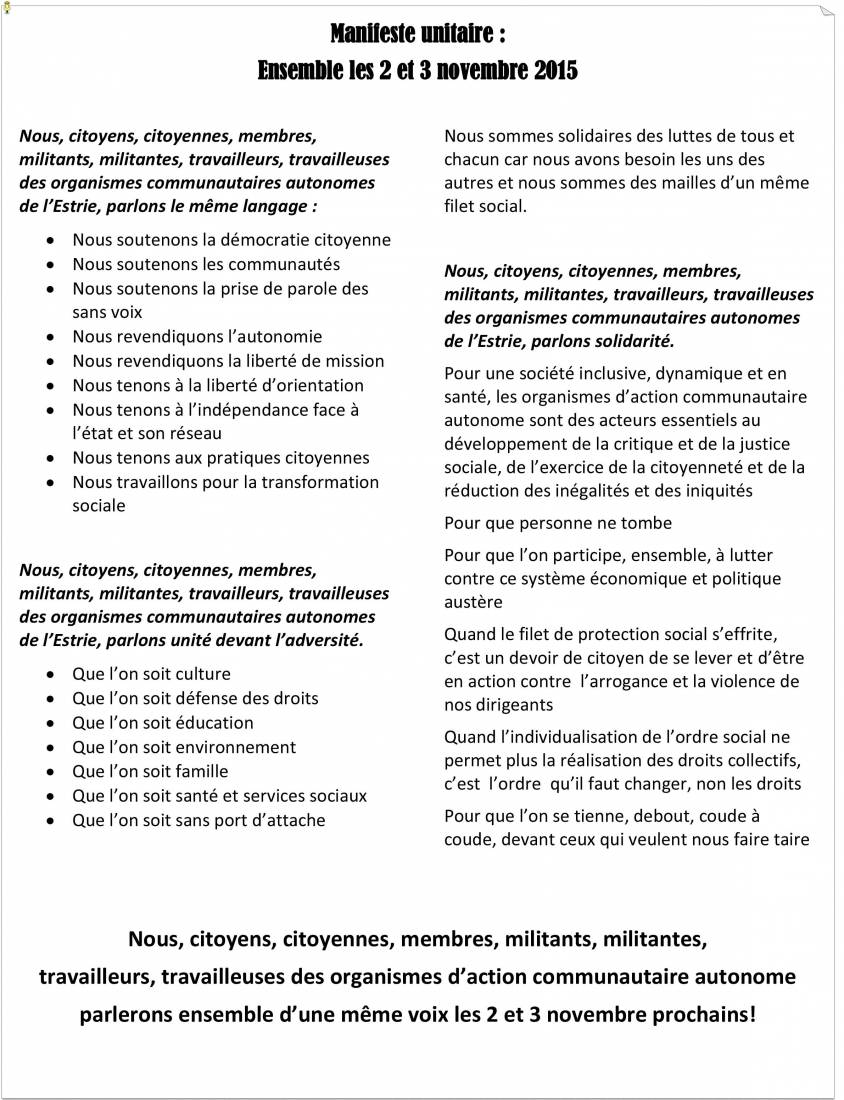 Le milieu communautaire estrien a rédigé un manifeste, dans un esprit d'unité et de solidarité, qui explique pourquoi il se mobilisera en grand, les 2 et 3 novembre prochains. Pour lire ce manifeste unitaire :