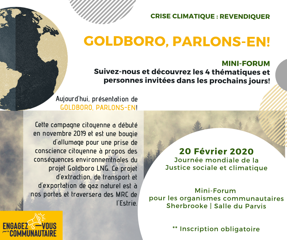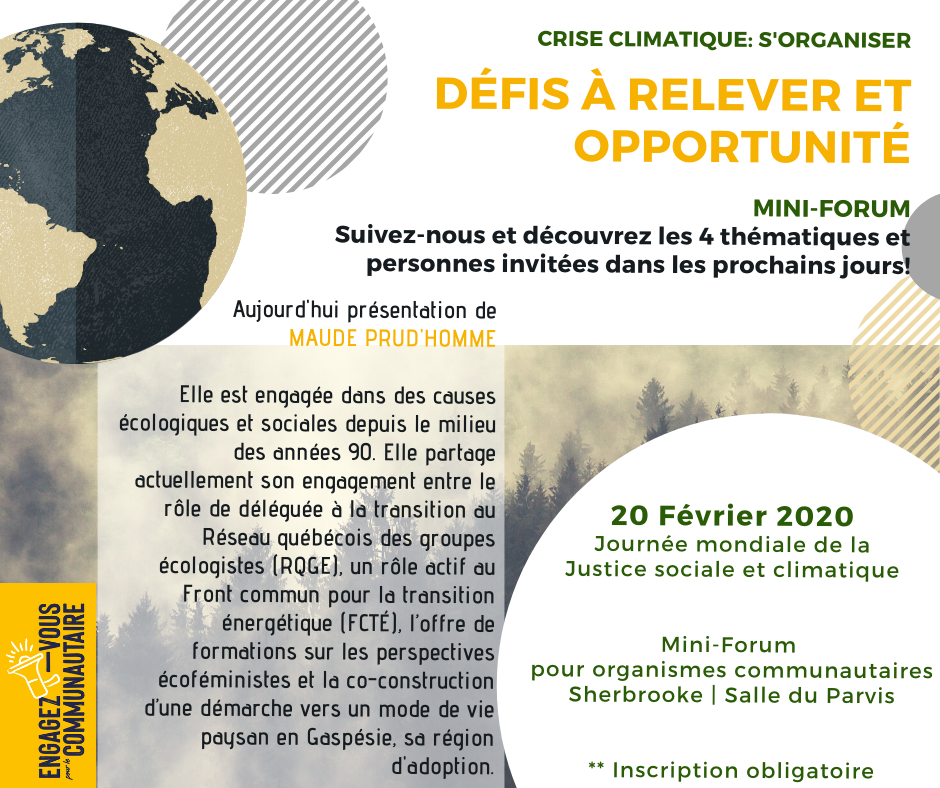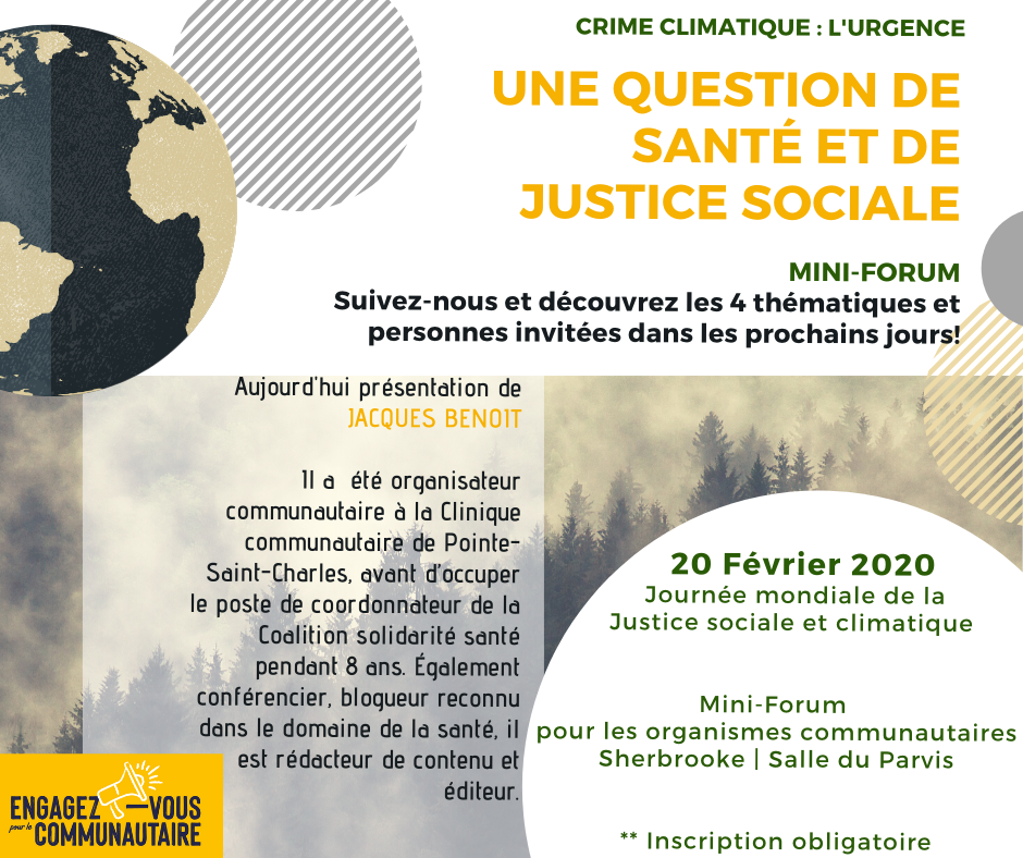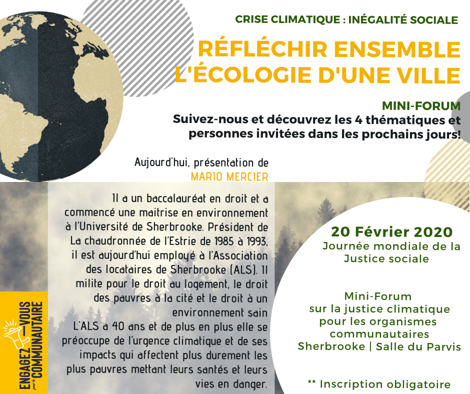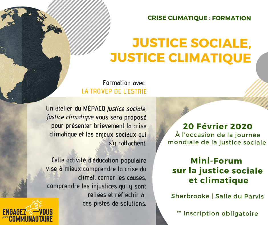 Dans le cadre de la Journée mondiale pour la justice sociale décrétée par l'ONU depuis 2009, le comité régional estrien d'Engagez-vous pour le communautaire, vous convie à ce mini-forum qui permettra de faire des liens entre l'importance d'inclure la justice climatique au sein de nos luttes sociales.