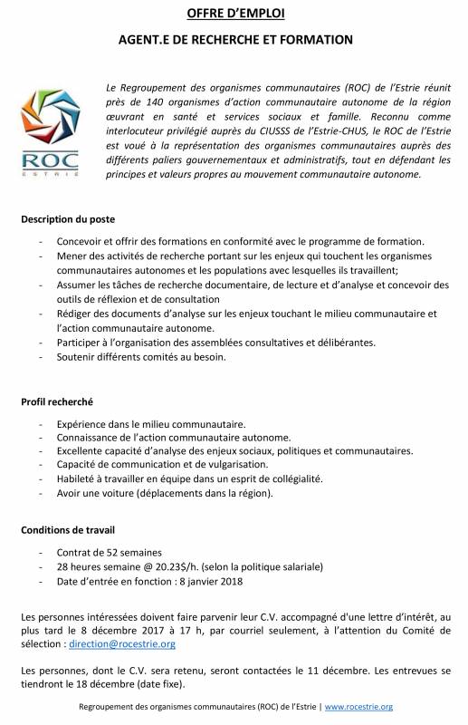 Le ROC de l'Estrie recherche un ou une agent-e de recherche et de formation: