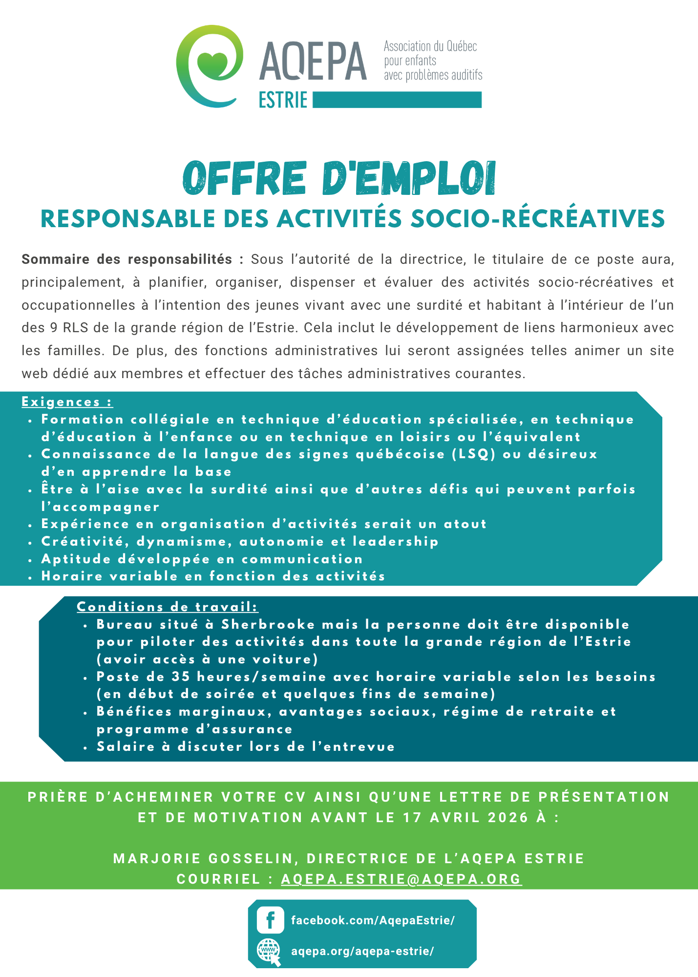 Responsable des activités socio-récréatives | AQEPA Estrie