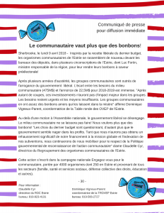 voir plusieurs réactions) ! Encore des bonbons distribués ici et là... Au PSOC, 17 millions seront injectés (10 M$ à la mission + 7M$ pour les salaires). Bien sûr ces sommes sont bienvenues. Mais ce que les organismes communautaires réclament, pour tous, c'est un investissement massif d'argent, STRUCTURANT, avec une vision à long terme, au lieu d'un saupoudrage selon la cause médiatisée, la crise ou la saveur du mois... Le sous-financement chronique fait trop de dégâts à notre filet social, aux organismes d'ACA et aux personnes qui les fréquentent et y travaillent. Cette situation est intenable! C'est pour cela que nous sommes toutes et tous invité.e.s à nous mobiliser.
