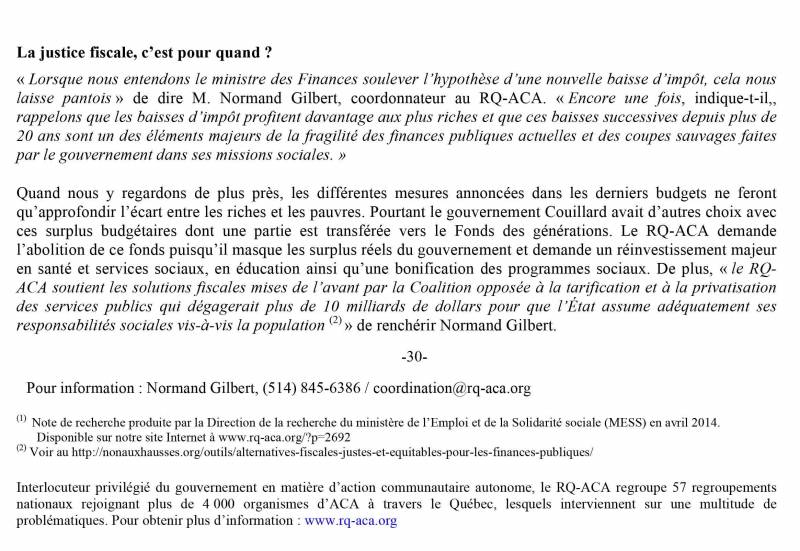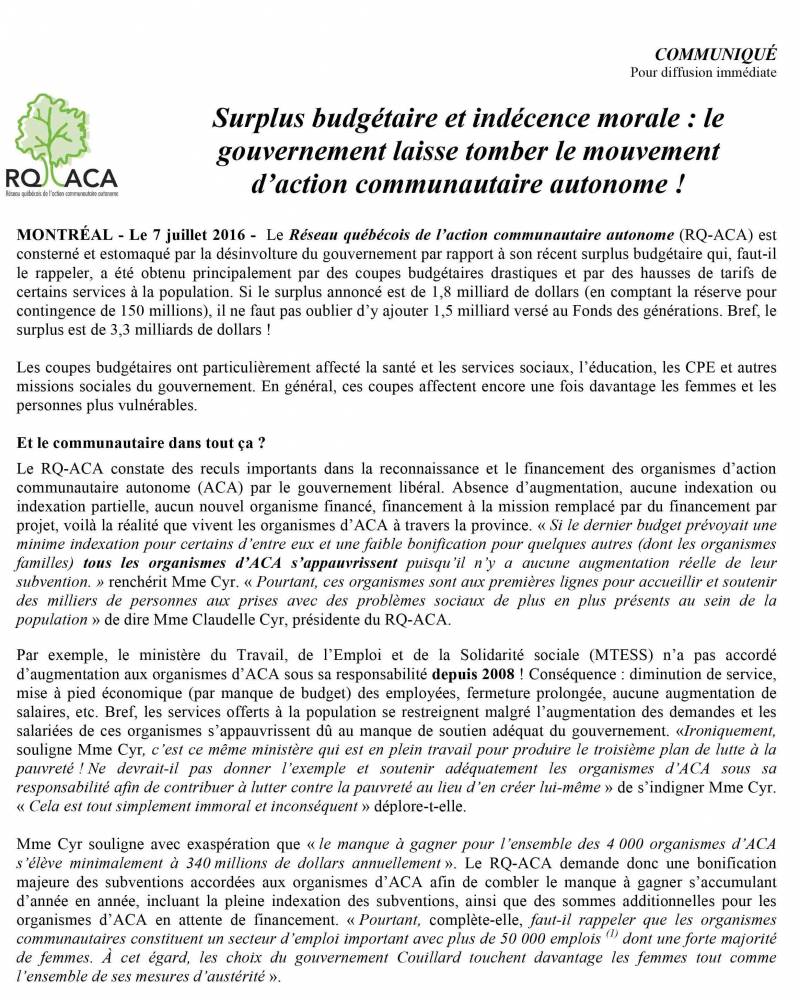MONTRÉAL - Le 7 juillet 2016 - Le Réseau québécois de l'action communautaire autonome (RQ-ACA) est consterné et estomaqué par la désinvolture du gouvernement par rapport à son récent surplus budgétaire qui, faut-il