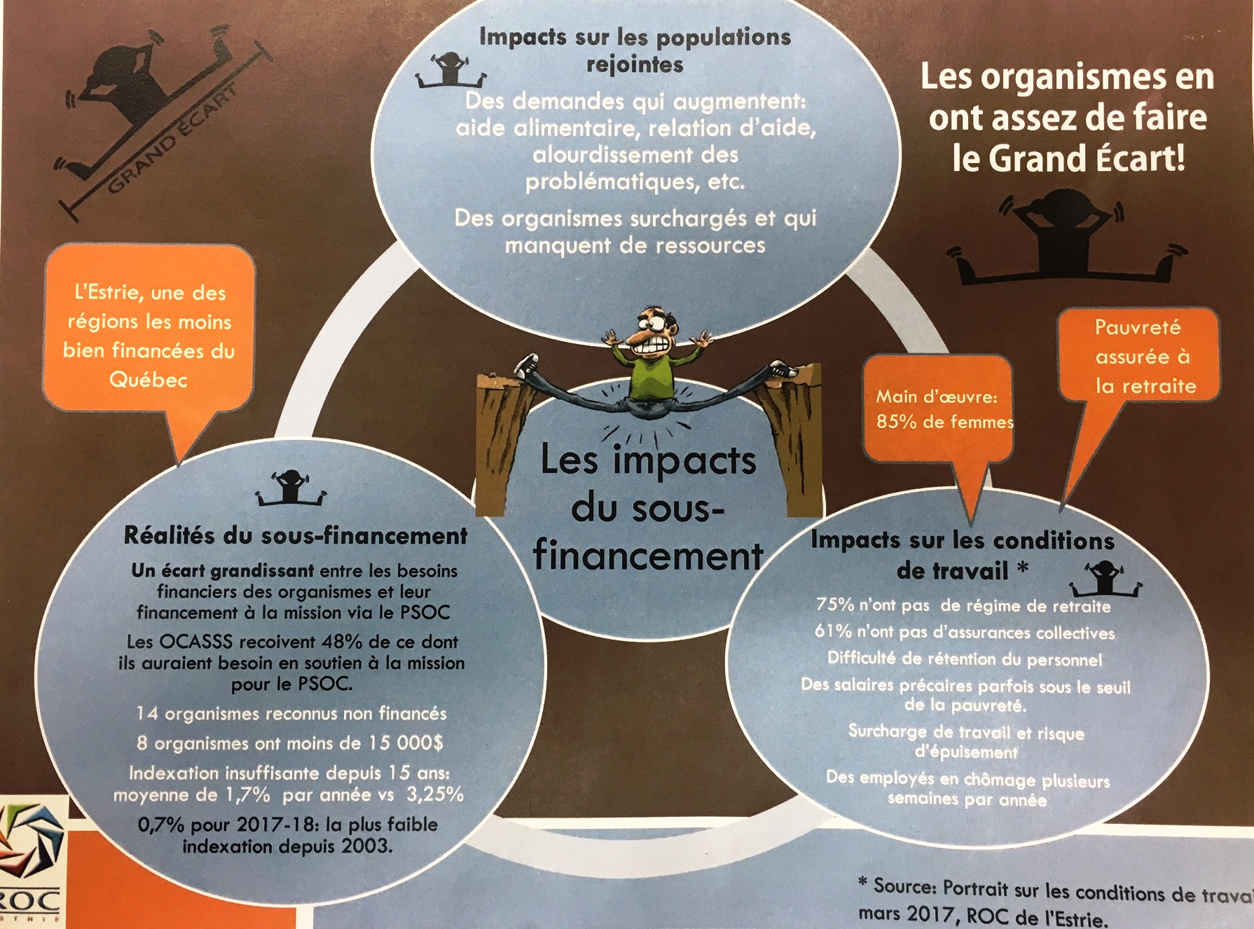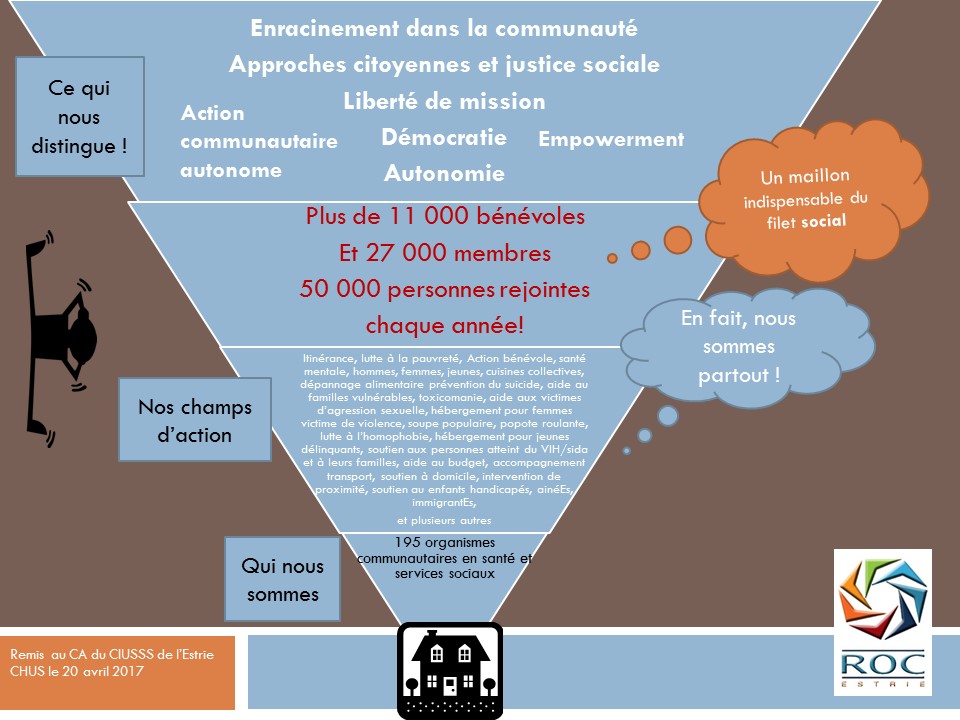 Le 20 avril, à 16h, des représentantEs du ROC de l'Estrie, accompagnéEs d'une dizaine de membres se sont présentEs à la séance publique du Conseil d'administration du CIUSSS de l'Estrie CHUS. Ils réclamaient des engagements de la part de l'administration afin de mettre fin au grand écart qui persiste entre leurs besoins financiers et la subvention qu'ils reçoivent.